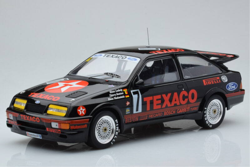 The Ford Sierra RS500 Cosworth Texaco #7 K. Ludwig / K. Niedzwiedz / T. Boutsen 24 Hours of Spa 1987 IXO 1:18 is crafted from Diecast. Die-cast zinc alloy body with detailed plastic parts, rubber tires, and high-quality paint finish. Die-cast models are known for their weight, durability, and realistic feel.