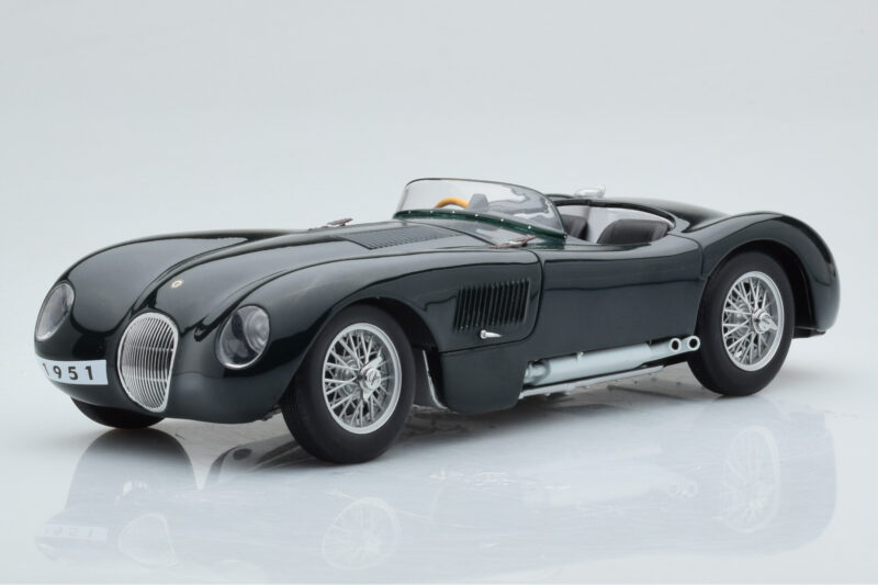 The Jaguar C-Type Green AUTOart 1:18 is crafted from Diecast. Die-cast zinc alloy body with detailed plastic parts, rubber tires, and high-quality paint finish. Die-cast models are known for their weight, durability, and realistic feel.
