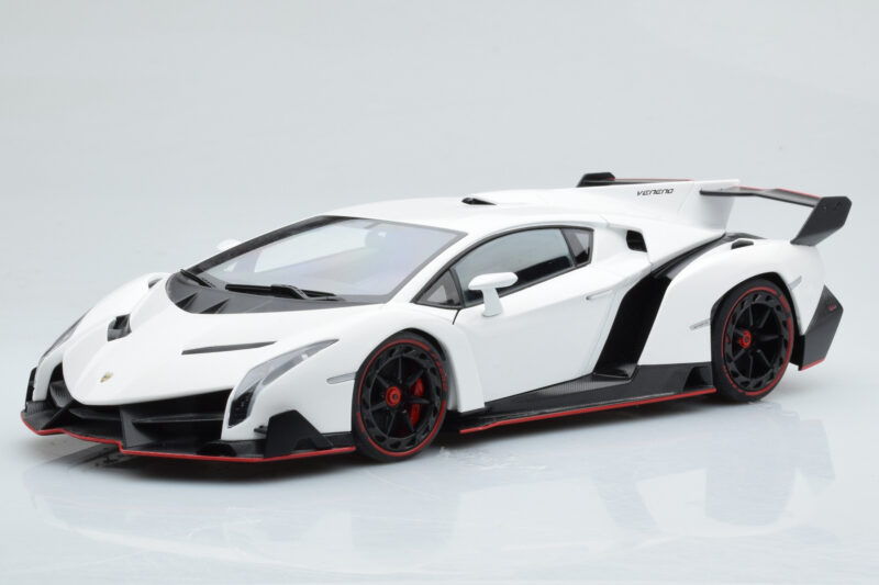 The Lamborghini Veneno White AUTOart 1:18 is crafted from Diecast. Die-cast zinc alloy body with detailed plastic parts, rubber tires, and high-quality paint finish. Die-cast models are known for their weight, durability, and realistic feel.