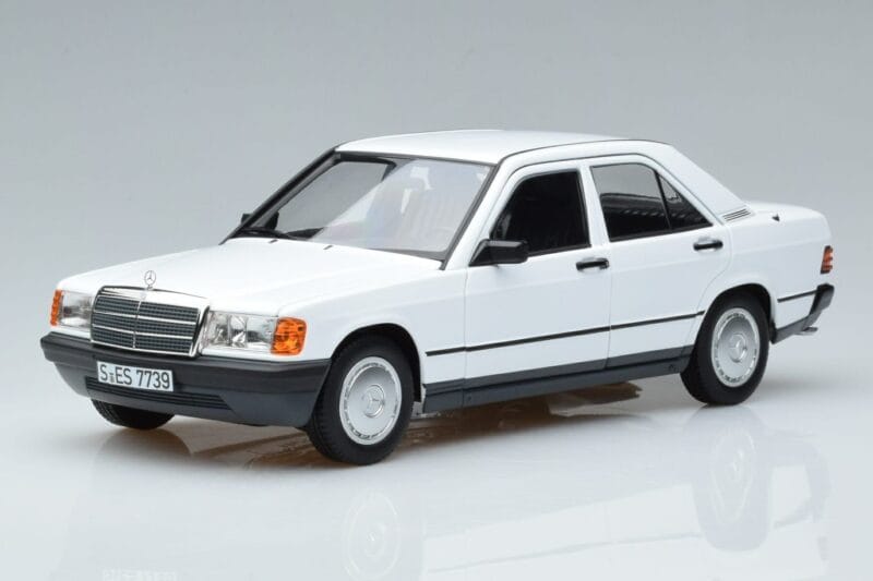 The Mercedes 190 E W201 White Norev 1:18 is crafted from Diecast. Die-cast zinc alloy body with detailed plastic parts, rubber tires, and high-quality paint finish. Die-cast models are known for their weight, durability, and realistic feel.