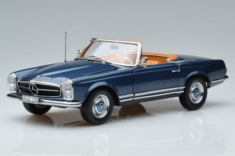 The Mercedes 230 SL W113 Pagoda Blue Limited Edition Norev 1:18 is crafted from Diecast. Die-cast zinc alloy body with detailed plastic parts, rubber tires, and high-quality paint finish. Die-cast models are known for their weight, durability, and realistic feel.