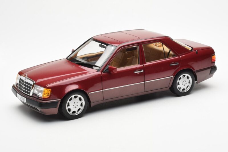 The Mercedes 500E W124 Red Metallic Dealer Edition Norev 1:18 is crafted from Diecast. Die-cast zinc alloy body with detailed plastic parts, rubber tires, and high-quality paint finish. Die-cast models are known for their weight, durability, and realistic feel.