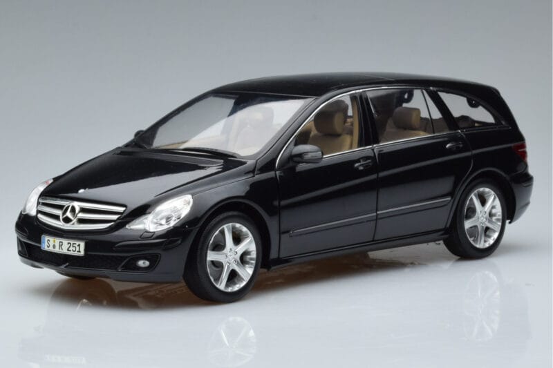 The Mercedes R-Class W251 Obsidian Black Minichamps 1:18 is crafted from Diecast. Die-cast zinc alloy body with detailed plastic parts, rubber tires, and high-quality paint finish. Die-cast models are known for their weight, durability, and realistic feel.