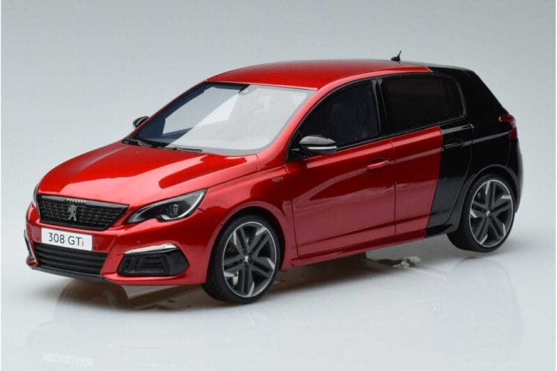 A 1:18 scale model measures approximately 25-28 cm (approximately 10-11 inches). The Peugeot 308 T9 GTI Red Otto 1:18 is perfect for display in a glass cabinet or on a shelf.