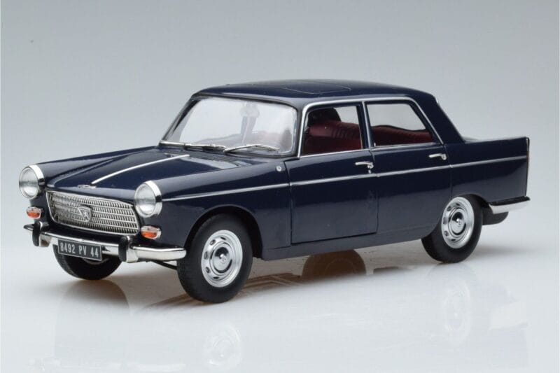 A 1:18 scale model measures approximately 25-28 cm (approximately 10-11 inches). The Peugeot 404 Blue Norev 1:18 is perfect for display in a glass cabinet or on a shelf.
