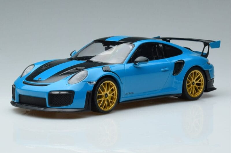 The Porsche 911 991.2 GT3 RS Weissach Package Miami Blue Gold Wheels Minichamps 1:18 is crafted from Diecast. Die-cast zinc alloy body with detailed plastic parts, rubber tires, and high-quality paint finish. Die-cast models are known for their weight, durability, and realistic feel.